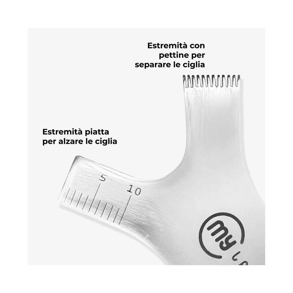 - Toothed side: equipped with fine teeth for combing, separating and aligning lashes or eyebrows, ensuring a defined and symmetrical result.
